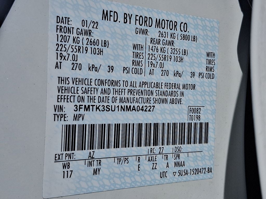 THIS VEHICLE INCLUDES THE FOLLOWING FEATURES AND OPTIONS: Equipment Group 300A, Ice White Appearance Package (Wheels: 19 Machined Face Aluminum), 10 Speakers, 4-Wheel Disc Brakes, ABS brakes, Air Conditioning, Alloy wheels, AM/FM radio: SiriusXM with 360L, AM/FM Stereo, Apple CarPlay/Android Auto, Auto High-beam Headlights, Auto-dimming Rear-View mirror, Automatic temperature control, Axle Ratio: 9.05, Brake assist, Bumpers: body-color, Compass, Delay-off headlights, Driver door bin, Driver vanity mirror, Dual front impact airbags, Dual front side impact airbags, Electronic Stability Control, Emergency communication system: 911 Assist, Exterior Parking Camera Rear, Four wheel independent suspension, Front anti-roll bar, Front Bucket Seats, Front Center Armrest, Front dual zone A/C, Front License Plate Bracket, Front reading lights, Fully automatic headlights, Garage door transmitter, Heated door mirrors, Heated front seats, Heated Perforated ActiveX Bucket Seats, Heated steering wheel, Illuminated entry, Knee airbag, Low tire pressure warning, Memory seat, Navigation system: Connected Navigation, Occupant sensing airbag, Outside temperature display, Overhead airbag, Overhead console, Panic alarm, Passenger door bin, Passenger vanity mirror, Power door mirrors, Power driver seat, Power Liftgate, Power passenger seat, Power steering, Power windows, Radio data system, Rain sensing wipers, Rear anti-roll bar, Rear seat center armrest, Rear side impact airbag, Rear window defroster, Rear window wiper, Remote keyless entry, Security system, SiriusXM Radio w/360L, Speed control, Speed-sensing steering, Speed-Sensitive Wipers, Split folding rear seat, Spoiler, Steering wheel mounted audio controls, SYNC 4A w/Enhanced Voice Recognition, Telescoping steering wheel, Tilt steering wheel, Traction control, Trip computer, Turn signal indicator mirrors, Variably intermittent wipers, and Wheels: 19 Machined-Face Aluminum. Odometer is 8368 miles below market average! 97/84 City/Highway MPG