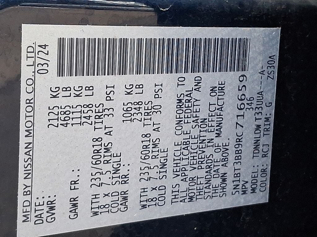 THIS VEHICLE INCLUDES THE FOLLOWING FEATURES AND OPTIONS: AWD, 4-Wheel Disc Brakes, 5.676 Axle Ratio, 6 Speakers, ABS brakes, Air Conditioning, Alloy wheels, AM/FM radio: SiriusXM, Auto High-beam Headlights, Automatic temperature control, Brake assist, Bumpers: body-color, Cloth Seat Trim w/Patterned Inserts, Delay-off headlights, Driver door bin, Driver vanity mirror, Dual front impact airbags, Dual front side impact airbags, Electronic Stability Control, Emergency communication system: NissanConnect Services, First Aid Kit, Floor Mats w/1-Piece Cargo Area Protector, Four wheel independent suspension, Front anti-roll bar, Front Bucket Seats, Front Center Armrest, Front dual zone A/C, Front reading lights, Fully automatic headlights, Heated door mirrors, Illuminated entry, Knee airbag, Low tire pressure warning, NissanConnect featuring Apple CarPlay and Android Auto, Occupant sensing airbag, Outside temperature display, Overhead airbag, Overhead console, Panic alarm, Passenger door bin, Passenger vanity mirror, Power door mirrors, Power driver seat, Power Liftgate, Power steering, Power windows, Radio data system, Radio: AM/FM NissanConnect, Rear anti-roll bar, Rear Parking Sensors, Rear seat center armrest, Rear side impact airbag, Rear window defroster, Rear window wiper, Remote keyless entry, Speed control, Speed-Sensitive Wipers, Split folding rear seat, Spoiler, Steering wheel mounted audio controls, Tachometer, Telescoping steering wheel, Tilt steering wheel, Traction control, Trip computer, Variably intermittent wipers, and Wheels: 18 Dark Painted Machine Finished Alloy. 28/35 City/Highway MPG