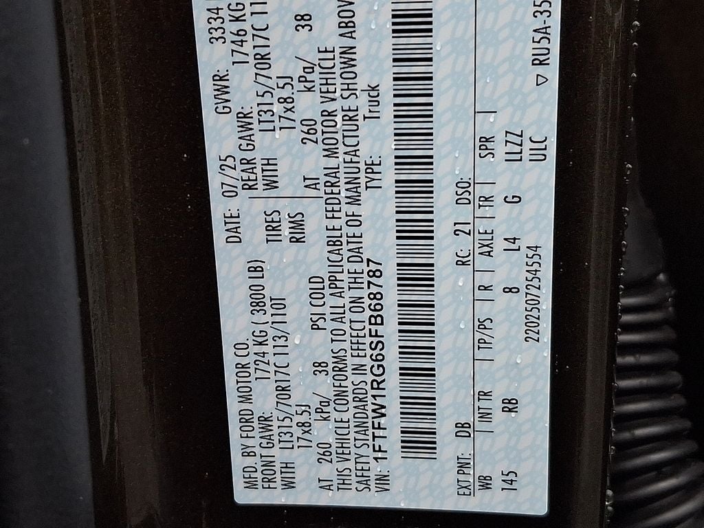 This Vehicle Includes the Following Options: Equipment Group 801A Standard, 4WD, 14 Speakers, 17 Cast Aluminum Wheels, 4-Wheel Disc Brakes, ABS brakes, Adjustable pedals, Air Conditioning, Alloy wheels, AM/FM radio: SiriusXM with 360L, Auto High-beam Headlights, Auto tilt-away steering wheel, Auto-dimming door mirrors, Auto-dimming Rear-View mirror, Automatic temperature control, Brake assist, Bumpers: body-color, Compass, Delay-off headlights, Driver door bin, Driver vanity mirror, Dual front impact airbags, Dual front side impact airbags, Electronic Locking w/4.10 Axle Ratio, Electronic Stability Control, Emergency communication system: SYNC 4 911 Assist, Front anti-roll bar, Front Bucket Seats, Front Center Armrest, Front dual zone A/C, Front fog lights, Front License Plate Bracket, Front reading lights, Front wheel independent suspension, Fully automatic headlights, Garage door transmitter, Heads-Up Display, Heated door mirrors, Heated front seats, Heated rear seats, Heated steering wheel, Illuminated entry, Internet access capable: FordPass Connect 5G, Lane Departure Warning System, Leather steering wheel, Leather Trimmed Seats, Low tire pressure warning, Memory seat, Navigation system: Connected Navigation, Occupant sensing airbag, Outside temperature display, Overhead airbag, Overhead console, Panic alarm, Passenger door bin, Passenger vanity mirror, Pedal memory, Power door mirrors, Power driver seat, Power passenger seat, Power steering, Power windows, Radio data system, Radio: B&O Unleashed Sound System by Bang & Olufsen, Rain sensing wipers, Rear reading lights, Rear step bumper, Rear window defroster, Remote keyless entry, Security system, Speed control, Speed-sensing steering, Split folding rear seat, Steering wheel memory, Steering wheel mounted audio controls, SYNC 4 w/Enhanced Voice Recognition, Tachometer, Telescoping steering wheel, Tilt steering wheel, Tough Bed Spray-In Bedl